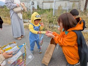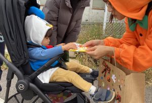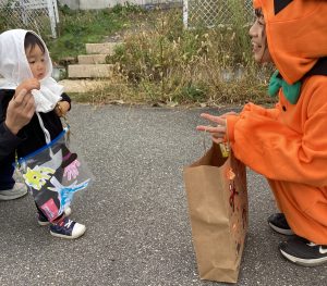 保育園の周辺のお散歩コースを歩いて、おばけに変身した保育士からお菓子をもらいの行きました