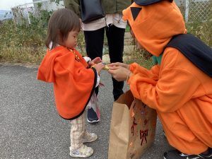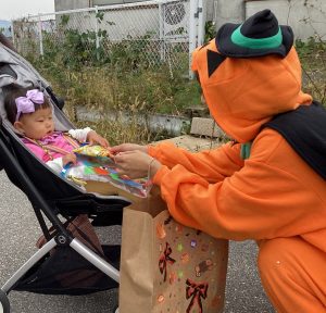 ちょっと恥ずかしいけれど、トッリクオアトリートの合言葉でお菓子をもらう事はできました