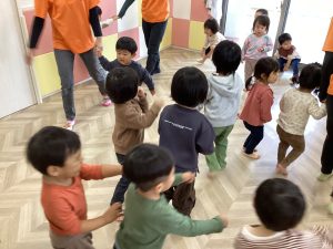 四分音符では、ヒューヒューと手を動かして動き、八部音符では手を上に上げて走り、二部音符では手を下にし大きく振ってヒューーヒューーと、リズムに合わせ『風』を表現してくれました🌪️