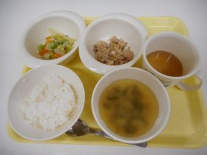 本日の給食メニュー ・ごはん ・高野豆腐の煮物 ・おかか和え ・粉ふき芋 ・たまねぎのみそ汁 &nb...