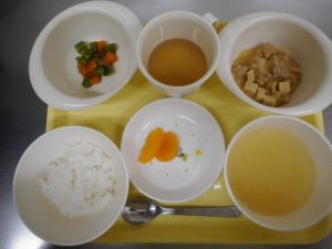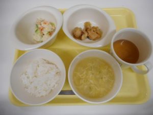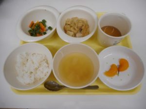 本日の給食メニュー ・ごはん ・チキンソテー ・含め煮 ・たまねぎのみそ汁 ・みかん缶 ...