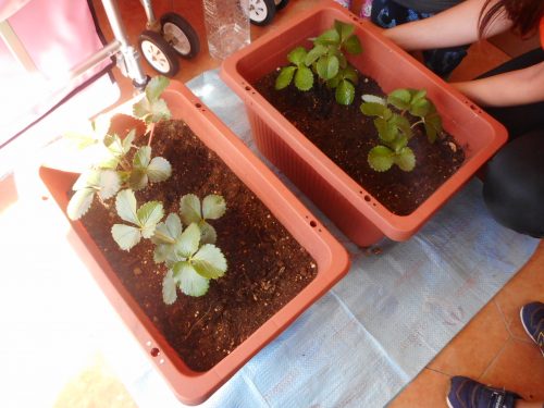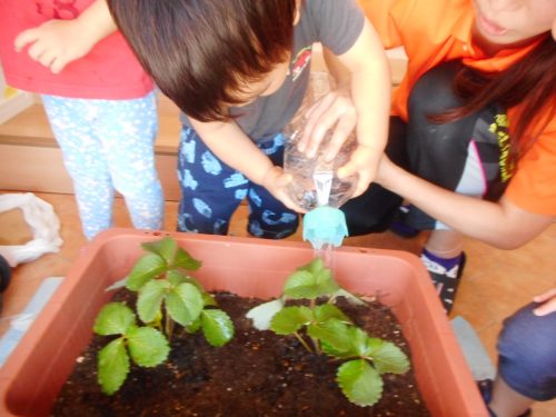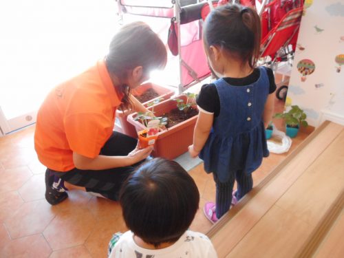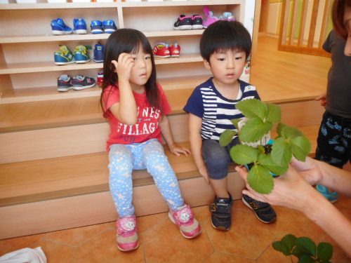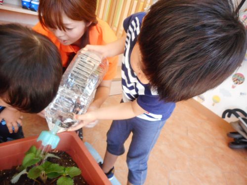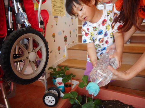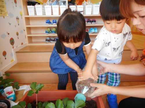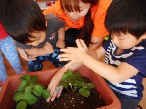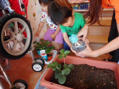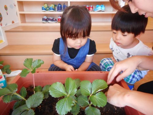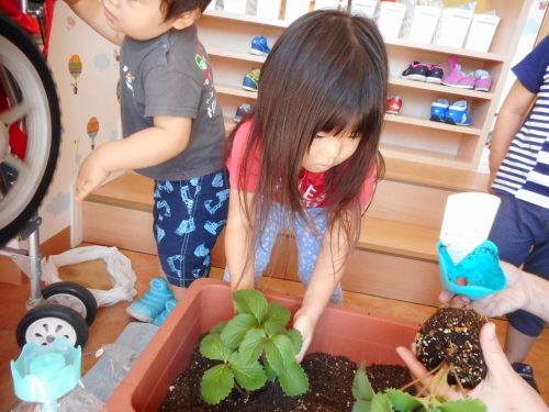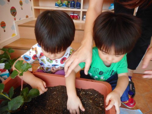 小規模保育・津田沼園のプランターに「いちごの苗」を植えました。