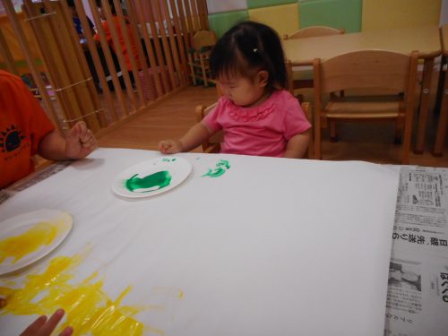 みどり・むらさき・オレンジの絵の具を使って指えのぐを