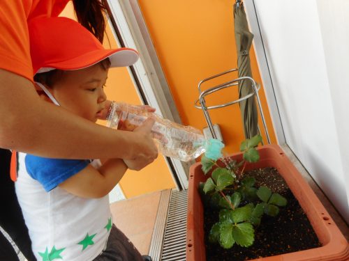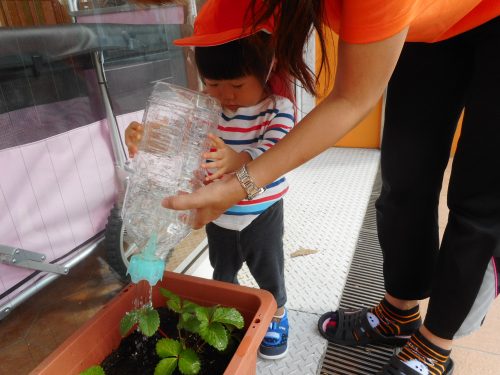 そしていちごの苗にみずをあげて、りんご組さんの