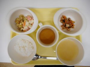 今日の給食メニュー ・ごはん ・みそ汁 ・ジャーマンポテト ・チキンソテーケチャップソースからめ ・...