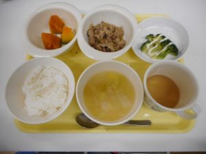 今日の給食メニュー ・ごはん ・みそ汁 ・焼肉 ・ブロッコリーマヨネーズがけ ・南瓜の甘煮 今日のお...