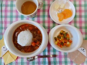本日のお給食メニュー ・ごはん ・ハヤシ風シチュー ・インゲンのサラダ ・チーズ ・みかん缶