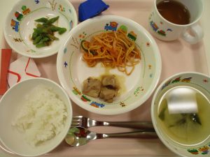 ご飯 味噌汁 とりのさっぱり煮 ツナ入りスパゲティソテー おかか和え