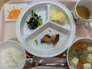 ご飯 味噌汁 魚の照り焼き 菜の花和え りんご