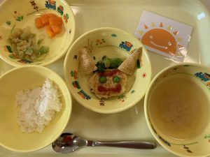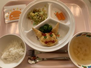 ※今日は節分のメニューでした。豆腐ハンバーグを赤鬼に変身させ、子どもたちも大喜びでした♪