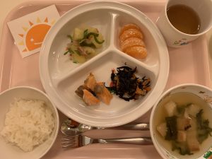 軟飯 味噌汁 鮭の塩焼き ひじきの炒り煮 ジャーマンポテト みかん