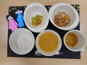 本日の給食メニュー ・ごはん ・鶏肉のマーマレード焼き ・七夕サラダ ・かぼちゃの甘辛煮 ・キャベツ...