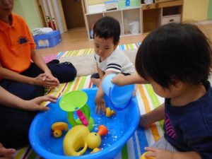 小規模保育・津田沼園 初めての夏です そして初めてのみずあそびが始まりました。 保育室内での水あそび...