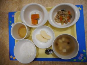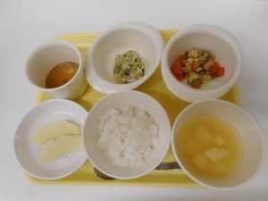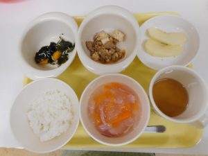 本日の給食メニュー ・ごはん ・マーボー豆腐 ・酢の物 ・りんご 本日の離乳食メニュー(初期食) ・...