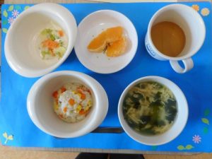 ・パン ・白身魚のトマトソース煮 ・ソテー ・コンソメスープ ・オレンジ 離乳食(中期~後期食) ・...