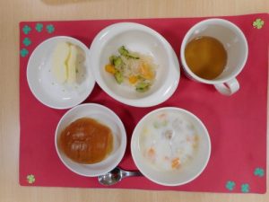 本日のメニュー ・ロールパン ・コーンクリームシチュー ・春雨あえ ・りんご 本日のメニュー 離乳...