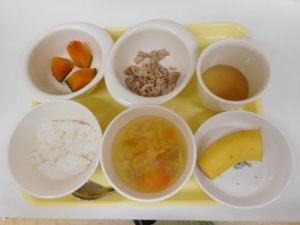 本日の給食メニュー ・ごはん ・豚肉のみの生姜焼き ・南瓜煮付 ・けんちん汁 ・バナナ 本日の離乳...