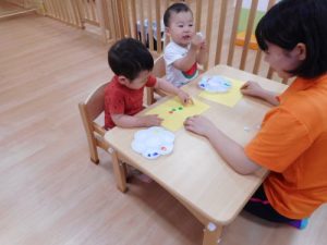 いちご組、初めての製作はシール貼り。 色とりどりのまあるいシールをシートからはがすのも けっこう集中...