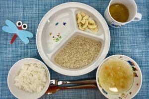 (写真は離乳食後期です。年齢によって形、固さ、盛り付け量を変えて、提供しています。)