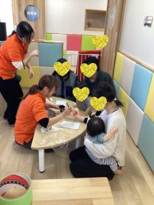 ももぐみさんは、親子で触れ合い遊びをしたあと、お母さん方にお子さんの手に絵の具をつけて手形を取り、お母さん方も手形を取ったいただきました🍑