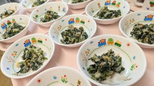(写真は1.2歳児食です。年齢によって盛り付け量を変えて提供しています。)