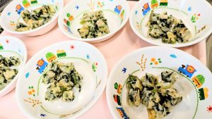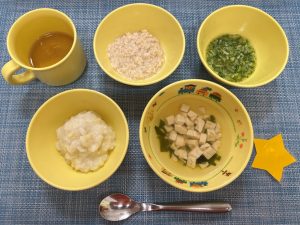 (写真は離乳食後期です。年齢によって形、固さ、盛り付け量を変えて、提供しています。)
