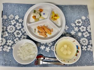 ご飯 すまし汁 鮭の塩焼き 里芋と野菜の煮物 キャベツのソテー