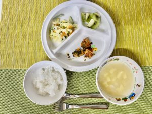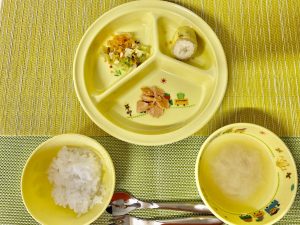 給食の時間に子どもたちの様子をのぞいたら、お友だちと楽しそうに話しながらご飯を食べている姿を見ることができました。