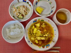 今日は子どもたちの大好きなカレーの日!お散歩して帰ってくると口いっぱいにカレーを食べている姿が見れました。
