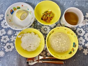 粥 鶏ひき肉と野菜のスープ煮 きゅうりとにんじんのおかか和え バナナ