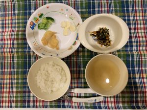 ご飯 味噌汁 魚のカレームニエル ひじきのサラダ チーズ