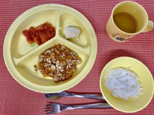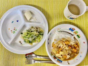 ハヤシシチューは大人気でみんなご飯をおかわりしてくれました♪お野菜もいっぱい食べて健康な身体を維持しましょう!
