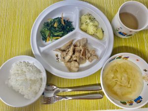 ご飯 味噌汁 豚肉のしょうが焼き ほうれん草のおかか和え 粉ふき芋