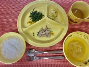 粥 味噌汁 鶏ひき肉のくず煮 ほうれん草のおかか和え 粉ふき芋