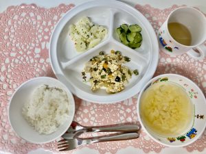①きゅうりを洗って、1cm位の角切り又は乱切りに、しおをしてしばらく置いて水気を手でしぼりザルに入れる。(園では衛生上茹でている)