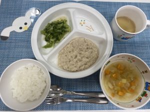 (写真は後期食です。月齢によって形、固さ、盛り付け量を変えて提供しています。)