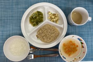 (写真は後期食です。月齢によって形、固さ、盛り付け量を変えて提供しています。)
