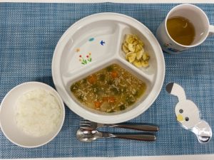 「カレーだ♪」と一人の子が言うと、「カレー♪カレー♪」とみんなで盛り上がってました!(^^)!2歳児クラスさんは、だんだんお話も上手になってきましたね♪今日もたくさん食べました!!