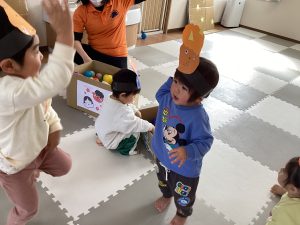豆に見立てたボールをぶつけて、みんなで協力して鬼退治をしました😊もちろん「福はー内」で、たくさん福を呼びよせましたよ✨