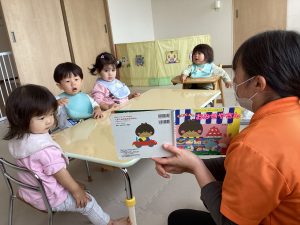 ももぐみや、いちごぐみのお友達も、読んでほしい絵本を持ってきて先生の膝に座ったり、