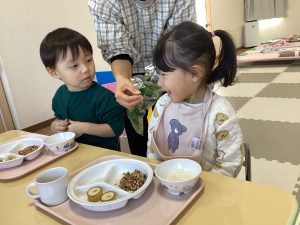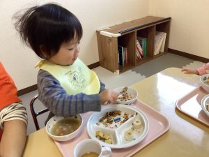 給食の時は、自分でご飯にふりかけをかけて、みんな「おいしいね」と言いながらパクパク食べていましたよ✨