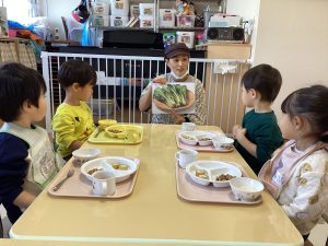「鮭は力が出るよ」「小松菜は風邪をやってけてくれるよ」と聞くと、子どもたちも「たくさん食べて強くなる」と話していました!