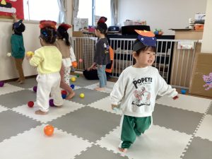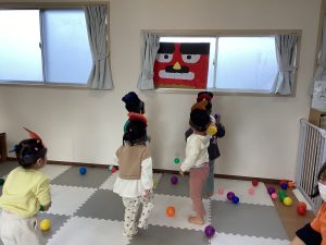 豆に見立てたボールをぶつけて、みんなで協力して鬼退治をしました😊もちろん「福はー内」で、たくさん福を呼びよせましたよ✨