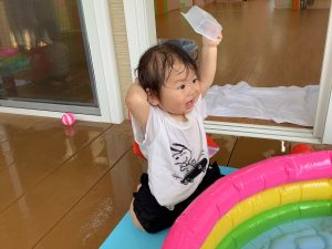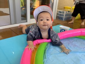 水遊び始めの頃は涙も見られていたももぐみさん。