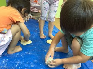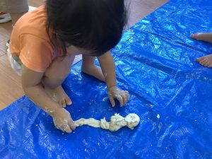 まずは小麦粉の状態に触れて「サラサラ〜!」「手白くなった〜」と発見を楽しむりんごぐみさん。