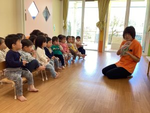 最後に保育者からの出し物は、「はらぺこあおむし」のシアターでした。内容を知っている子も多かったので、みんなで歌を口ずさみながら楽しみました!