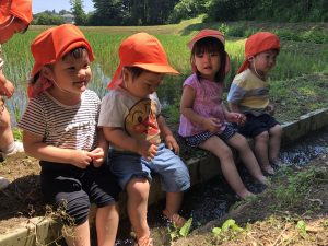 いちご組さんは園の近くの水路まで行き、自然の水で水遊び🧊
