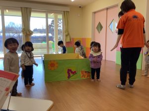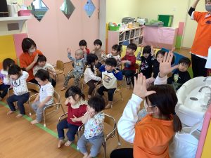 保育者が指定した音をハンドサインで当てるゲームでは迷いながらも