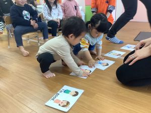 保育者のHow are you?の質問でカードを選び、自分の今の気分をお友だちに教えてくれましたよ!