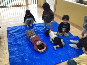 ブルーシートを出して準備をしていると「うみみたーい!」と海の中を泳ぐような仕草やバタ足をして見せてワクワクしながら待っていた子どもたち。